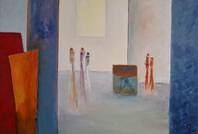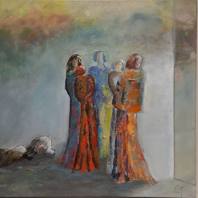 Mijn schilderijen worden vaak door lijnen, kleuren en vrouwenfiguren bepaald. De kleuren worden gevangen in lijnen.